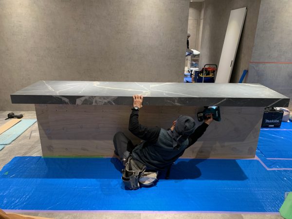 下地は合板ベニヤで、カウンター天板には大理石調の化粧パネルが貼られていますが、仕様をコンクリート打ち放し調に変更したいということMortex施工をさせていただきました。