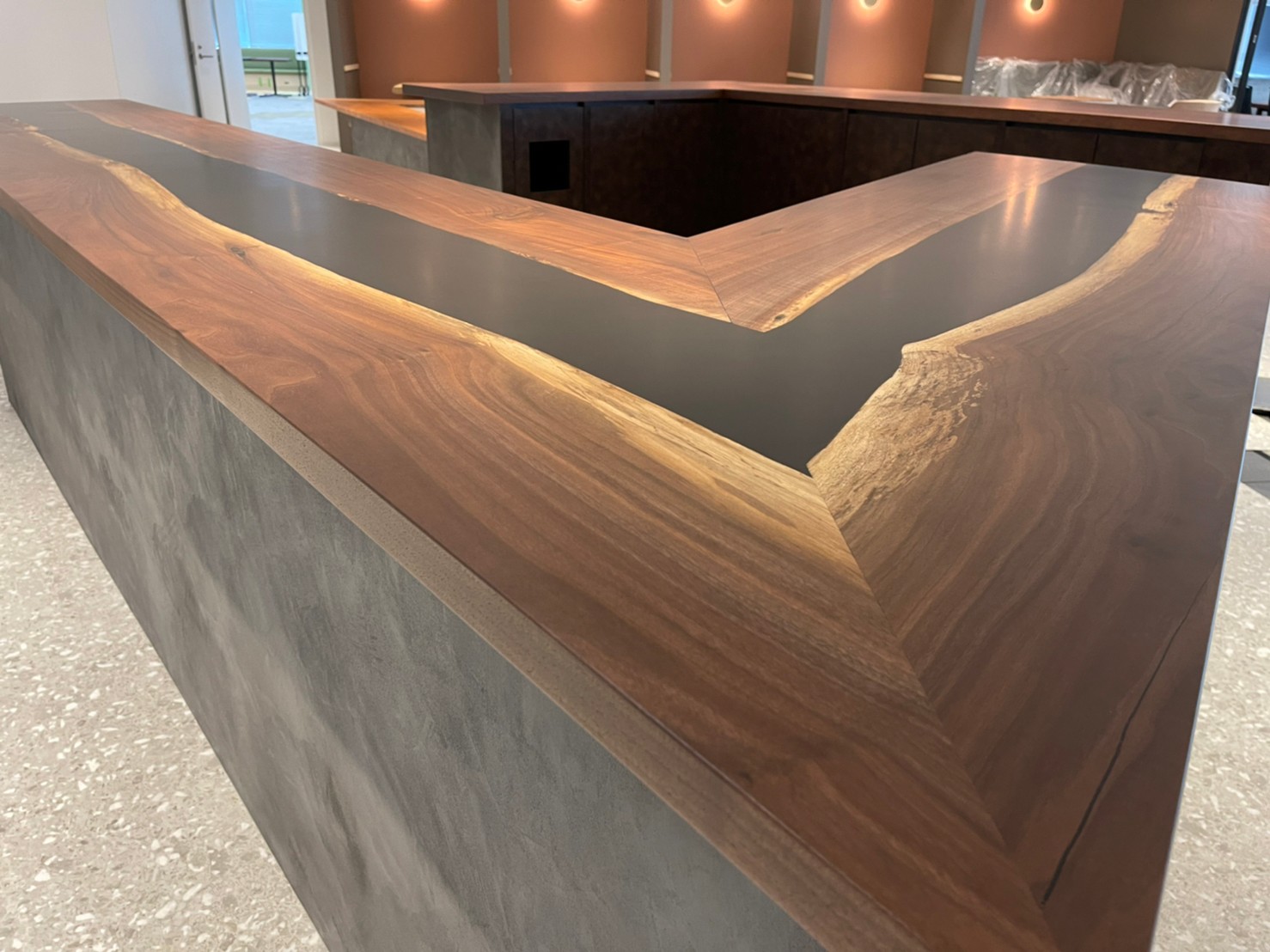 L字型のカウンターテーブルは一辺が10メートルほどの長さです。