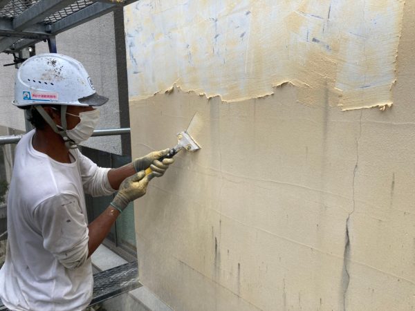 下地のモルタル層を傷つけないように 漆喰だけ2ミリほど削り取ります。