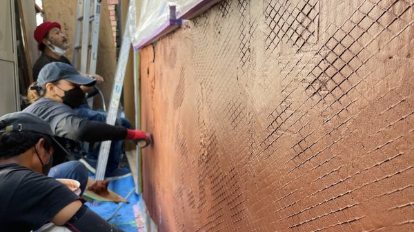 まずはラスカット下地にラスを貼りつけ、下塗りしてゆきます。
