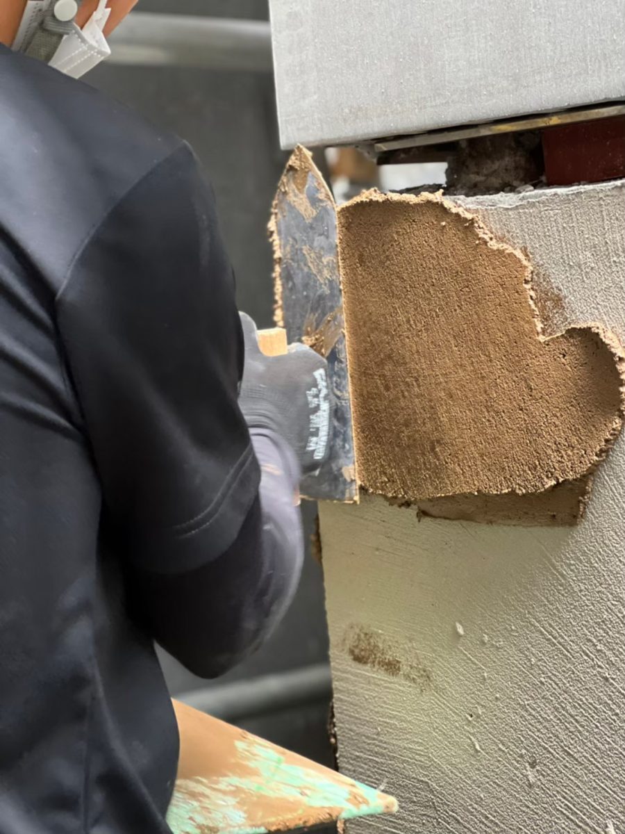 搔き落とし仕上げでは、表面の5ミリ程度の材料が粉のように落ちていきます。
