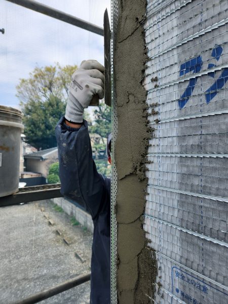 ↑ラス(網状の建築資材)にモルタルを塗り