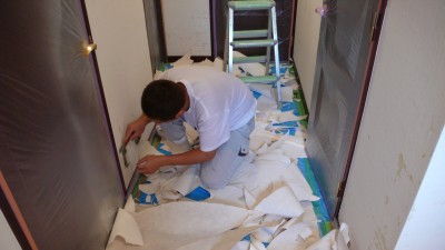 次に既存のクロスを剥がします。 はがれやすい物とそうでないものがあるようです。 クロス剥がしで時間をとられると結構痛いです。 その日の作業が予定どうりに終わらないことも・・・。(笑えません)