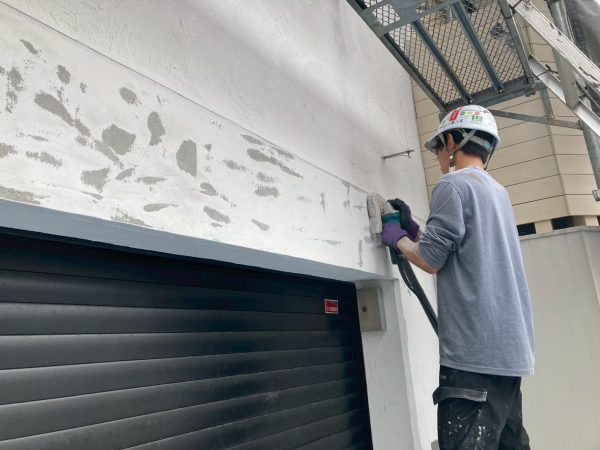 2mm厚を丁寧に削り取り、粉が舞わないよう散水しながら作業。