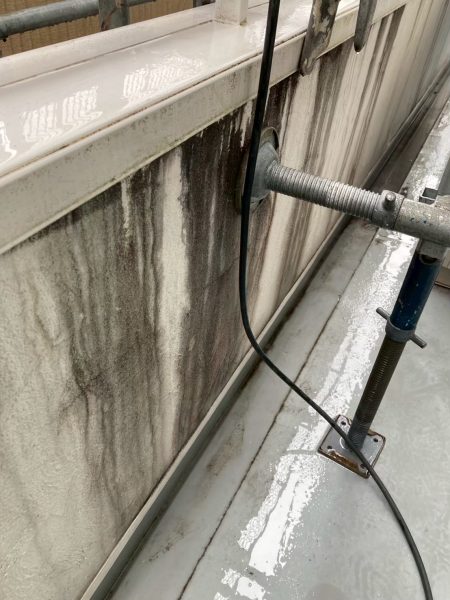 雨だれ汚れ、黒ずみが全体に広がっていた