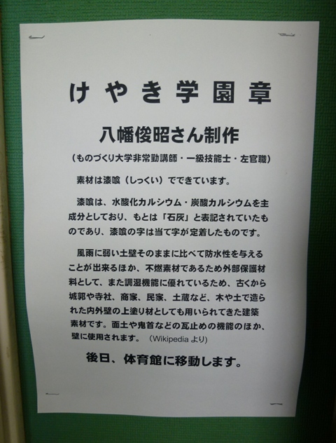 弊社社長がこしらえた『漆喰彫刻の校章』。